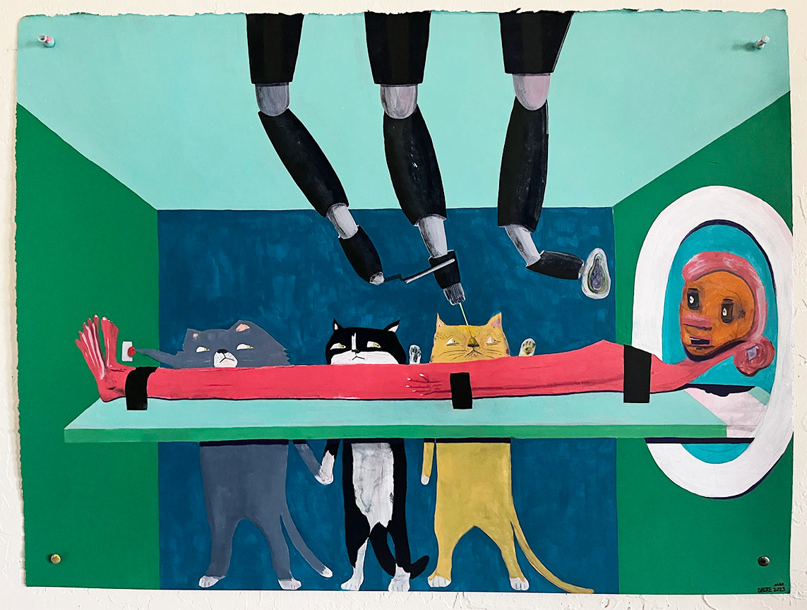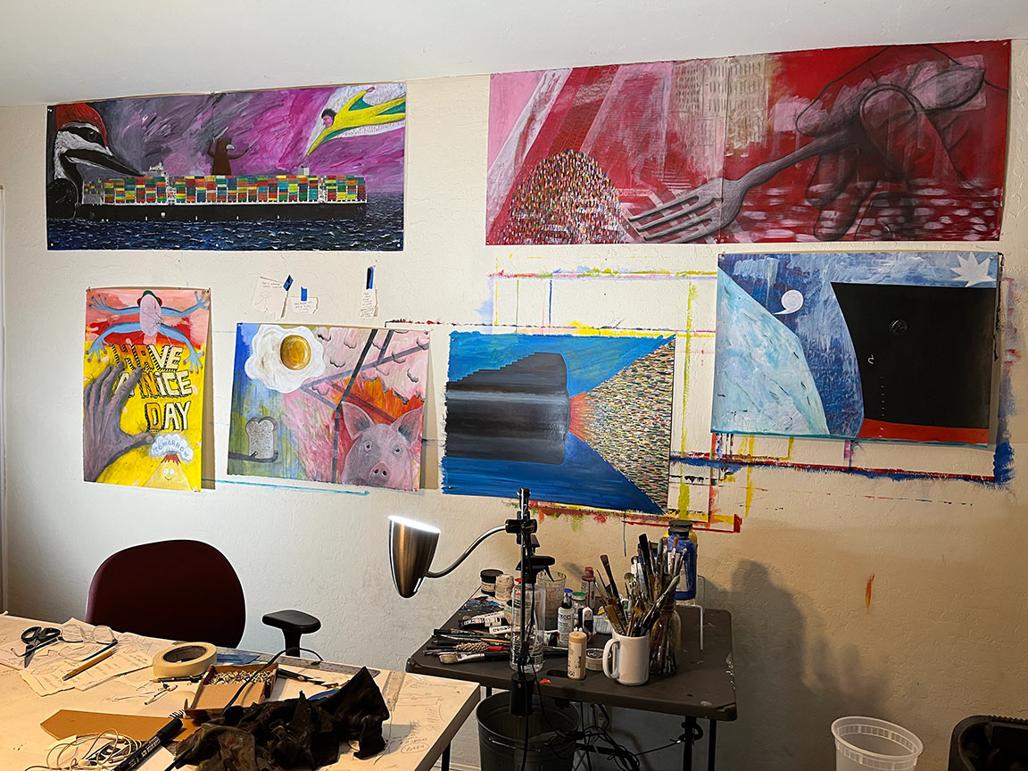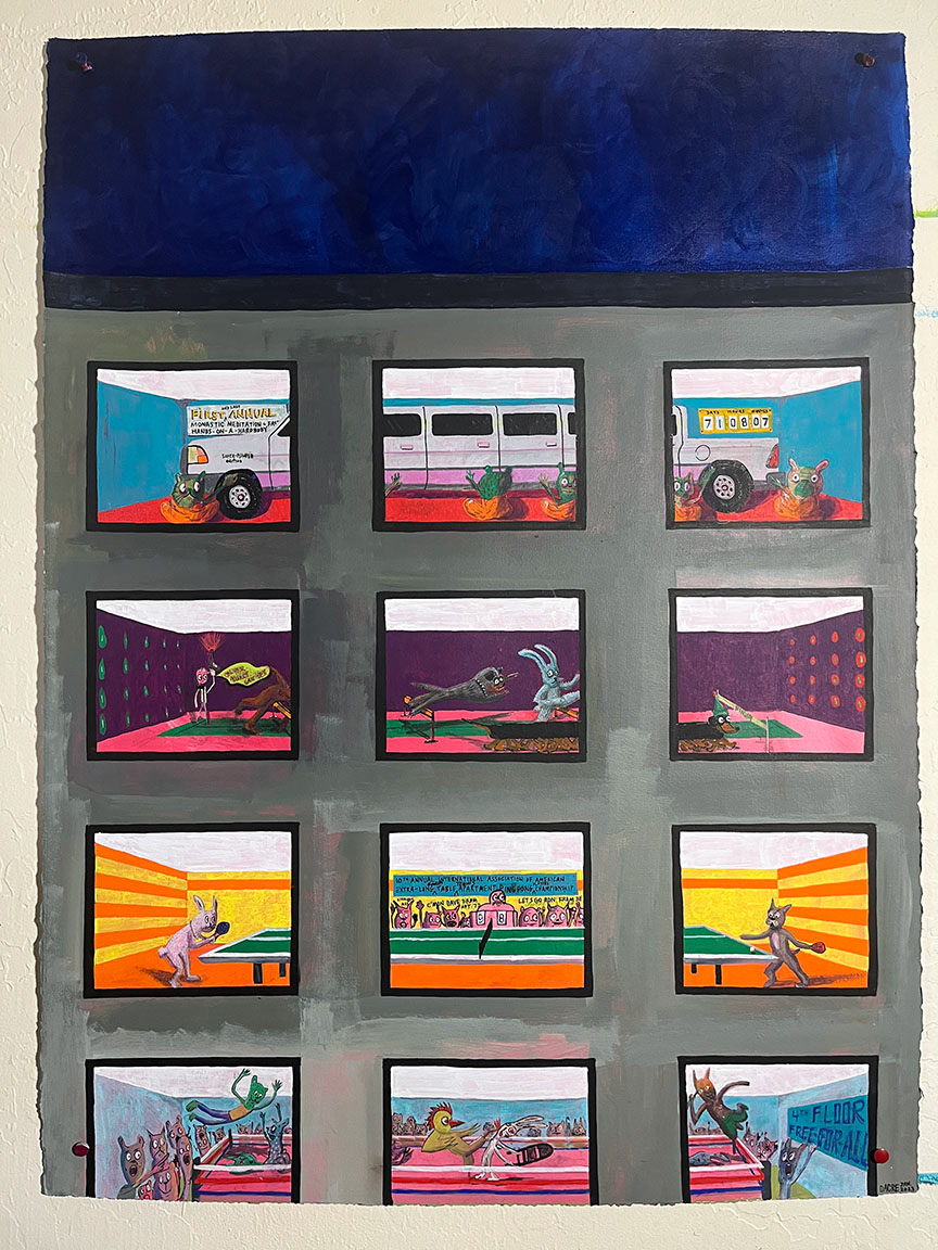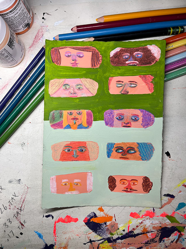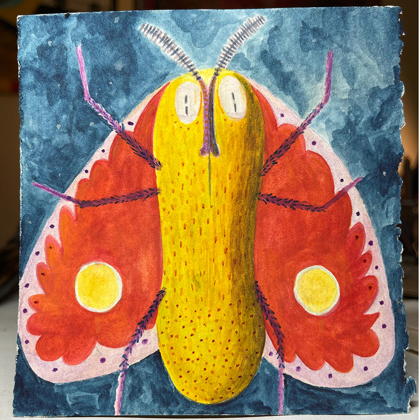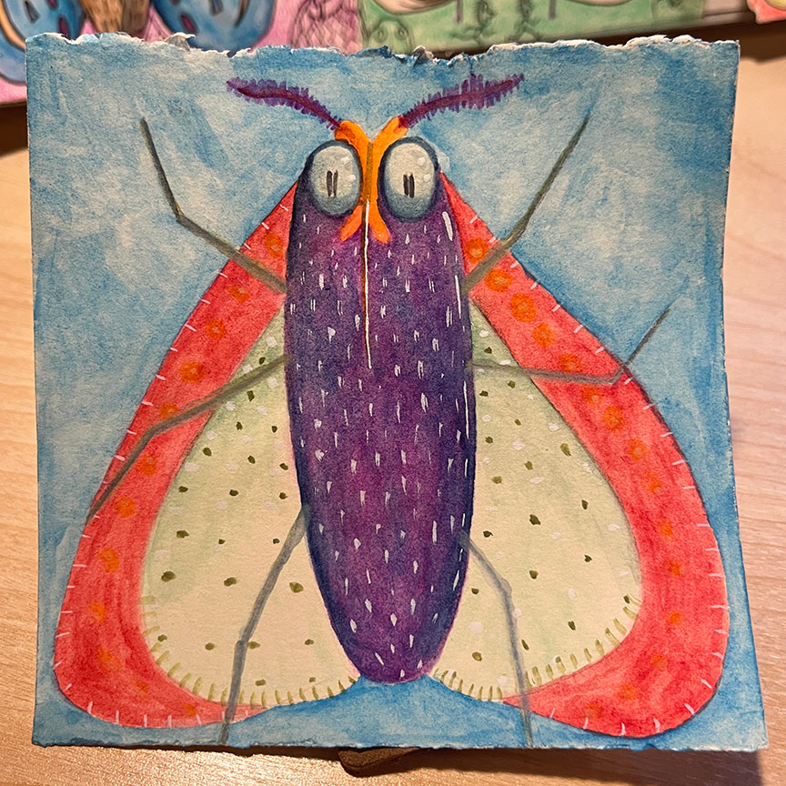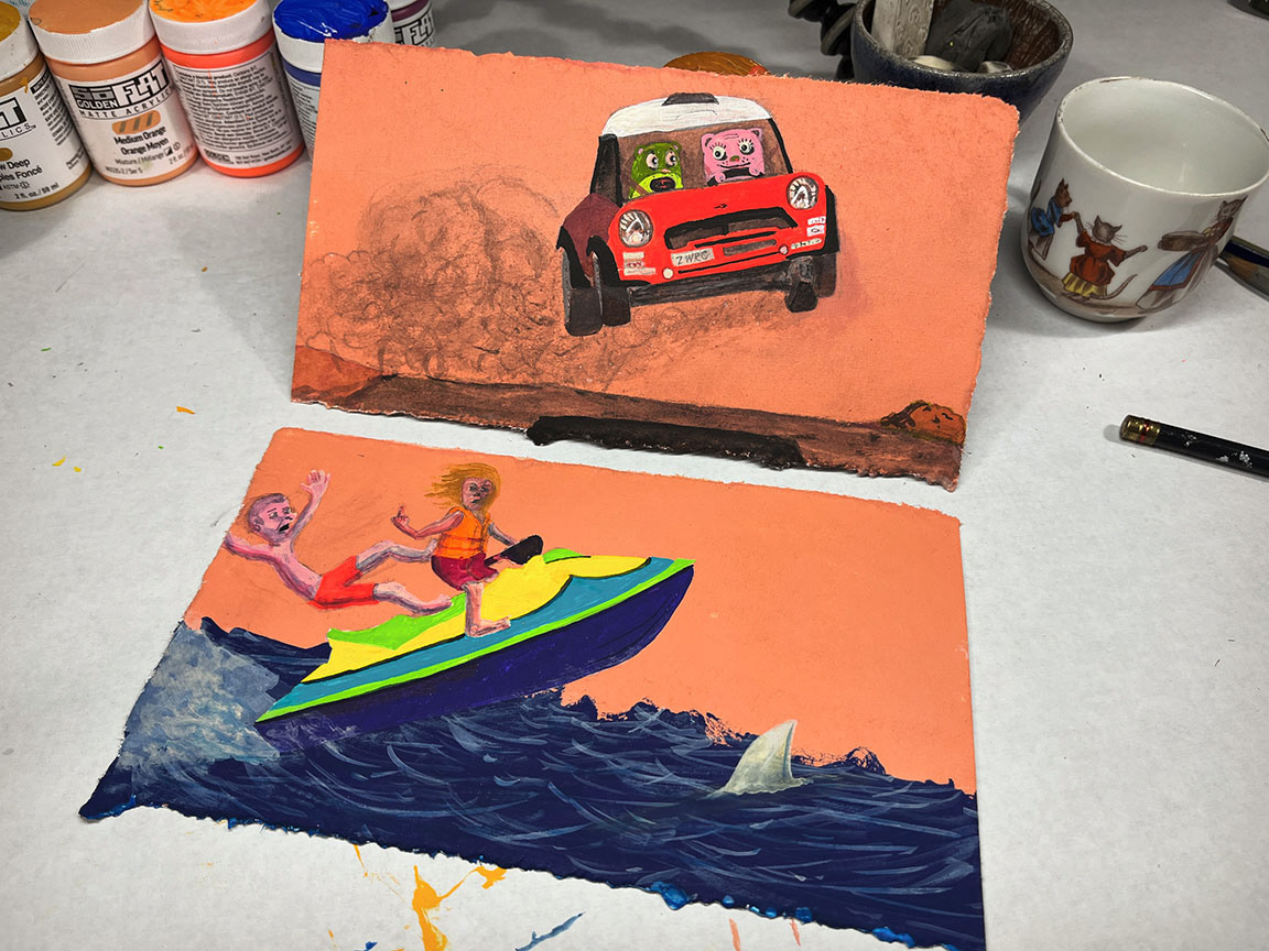 Paintings on heavy printmaking paper using bright colors and my skewed sense of humor.