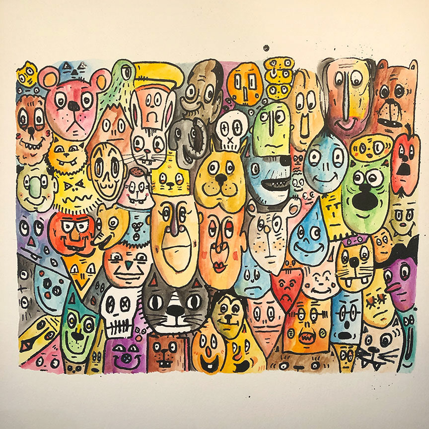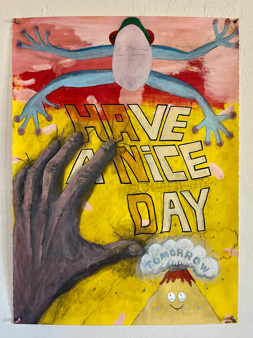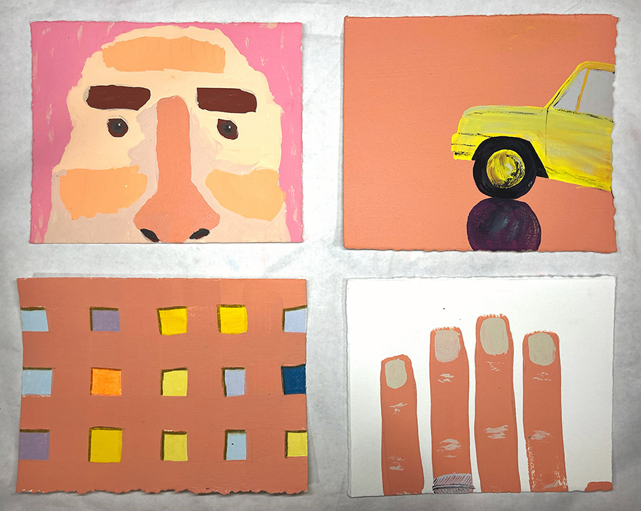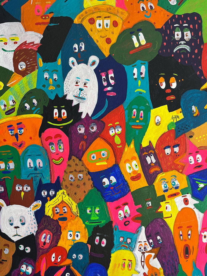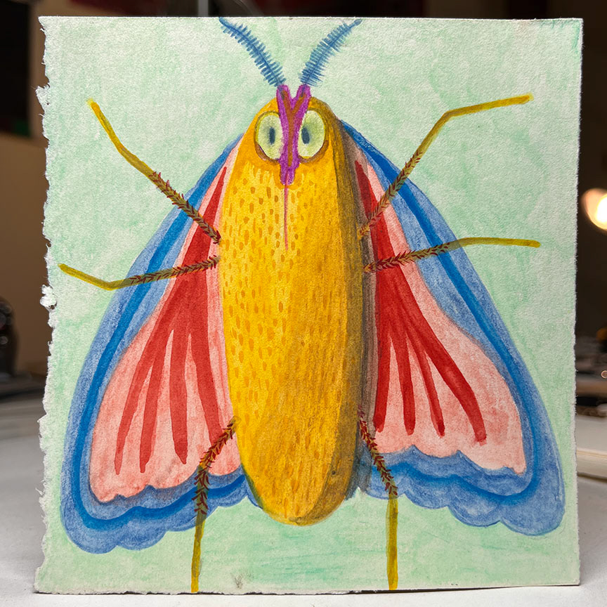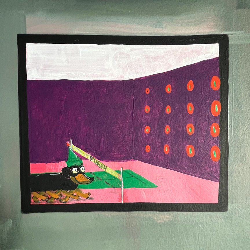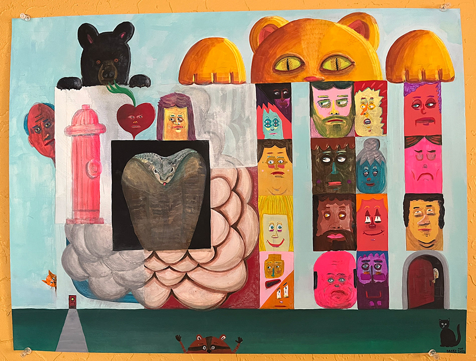 Paintings on heavy printmaking paper using bright colors and my skewed sense of humor.