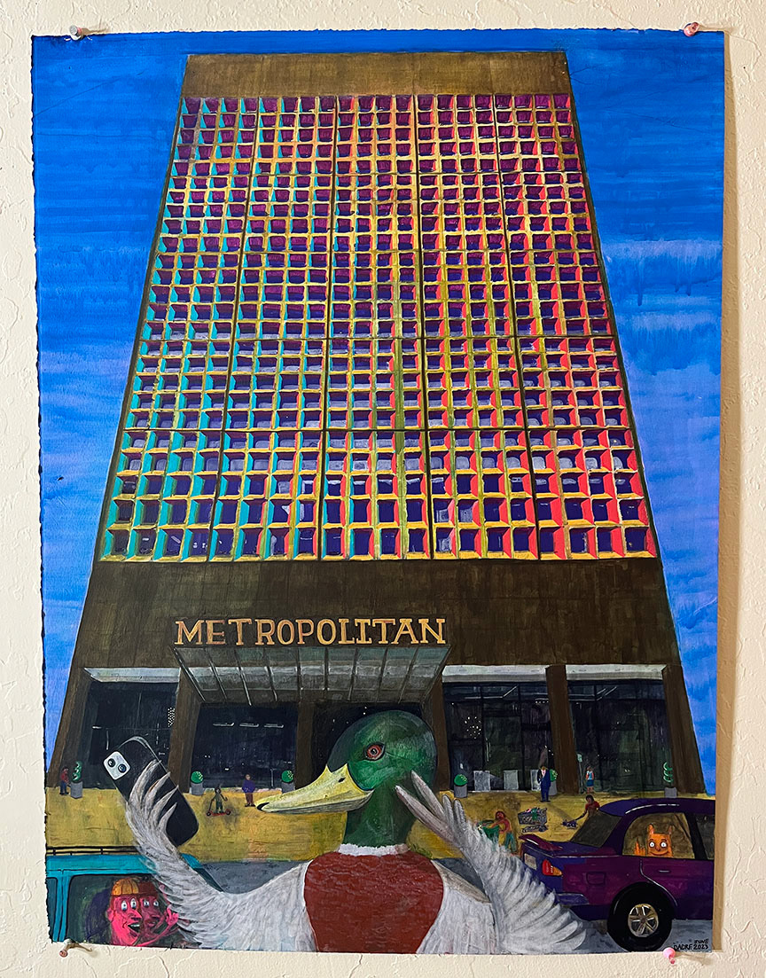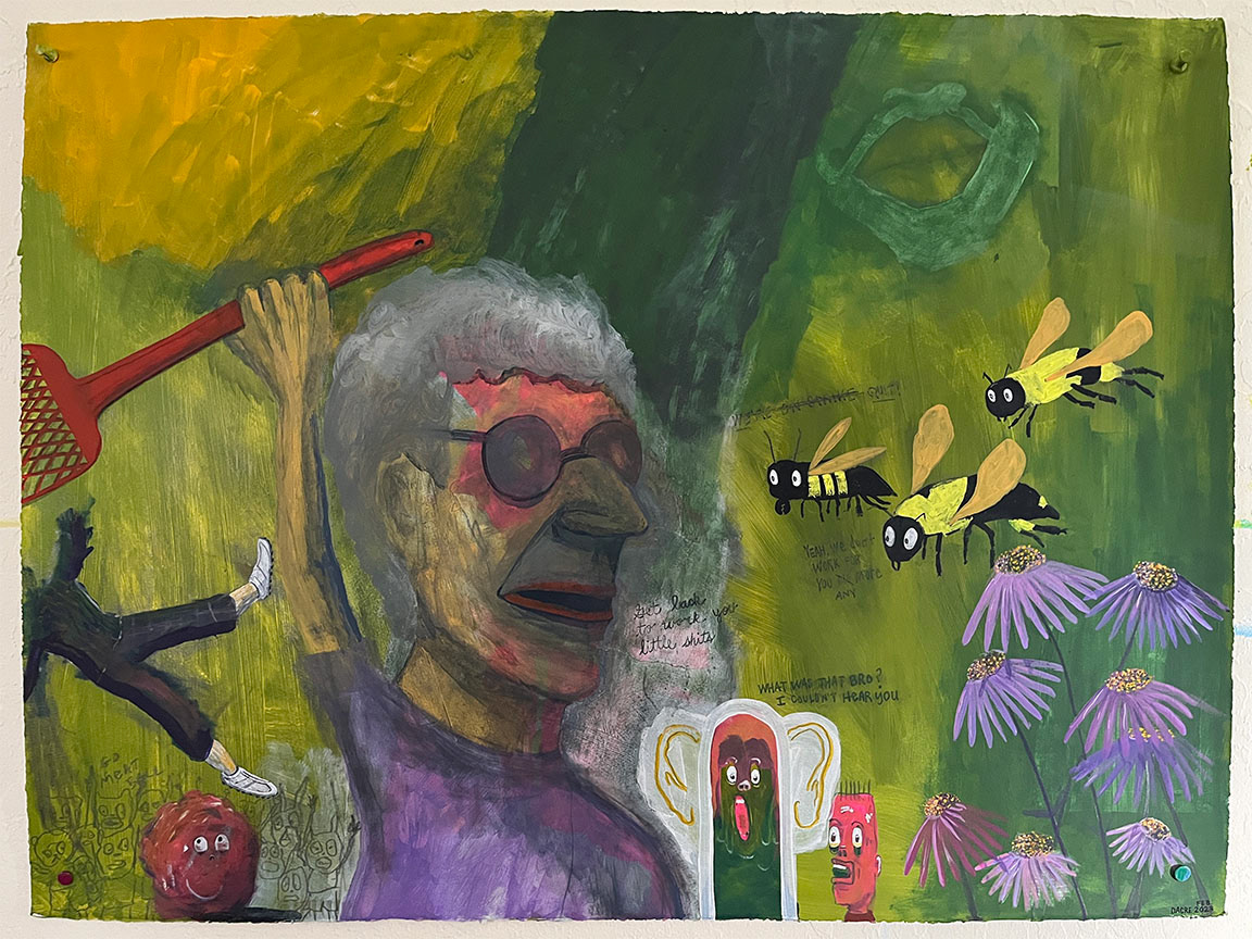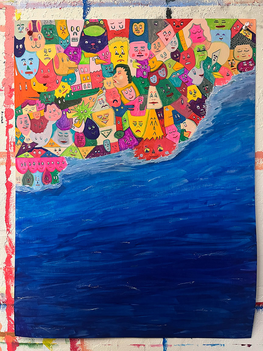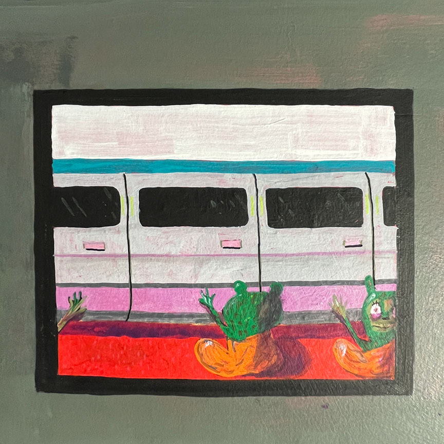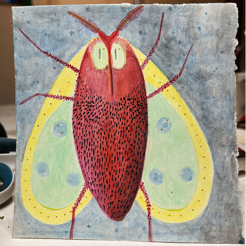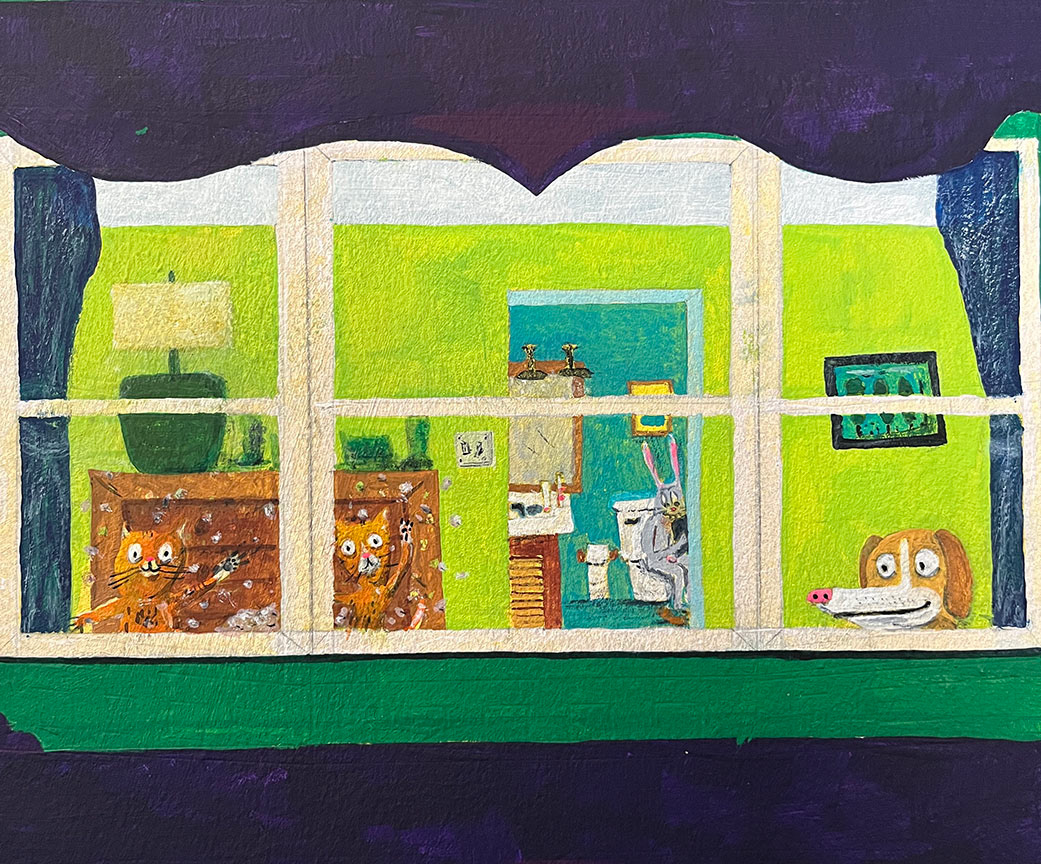 Paintings on heavy printmaking paper using bright colors and my skewed sense of humor.
