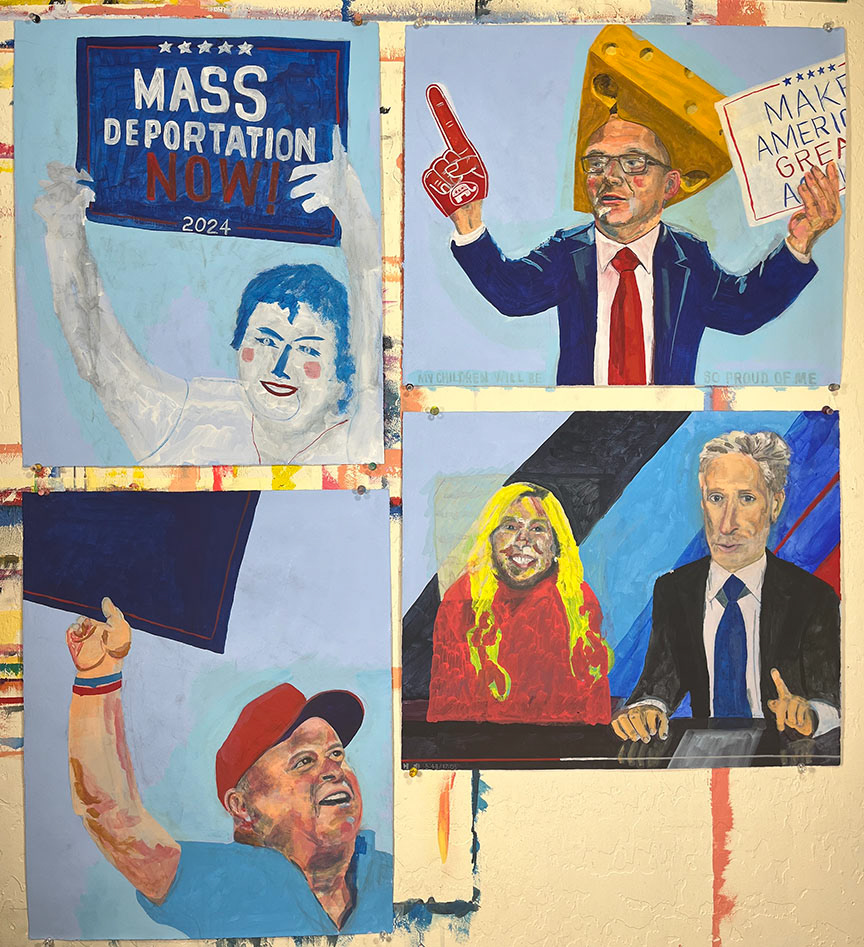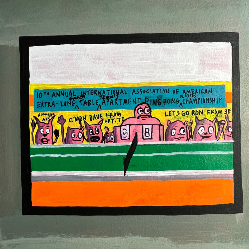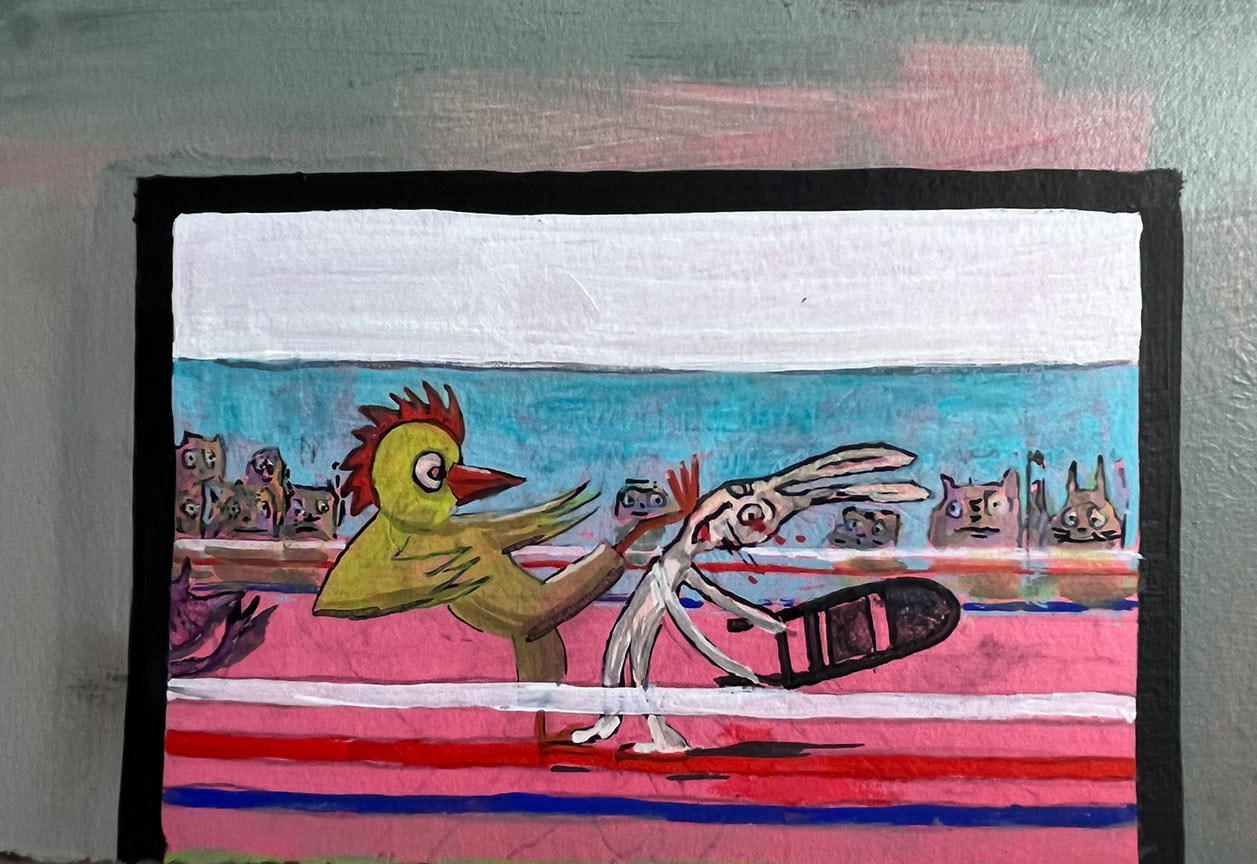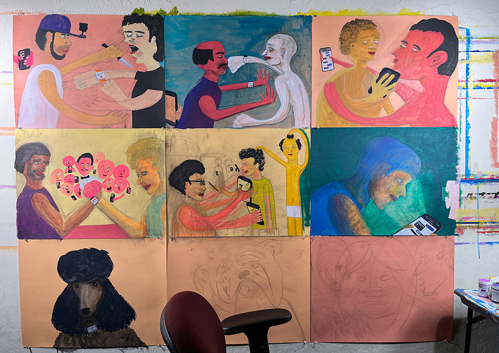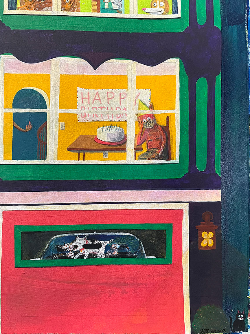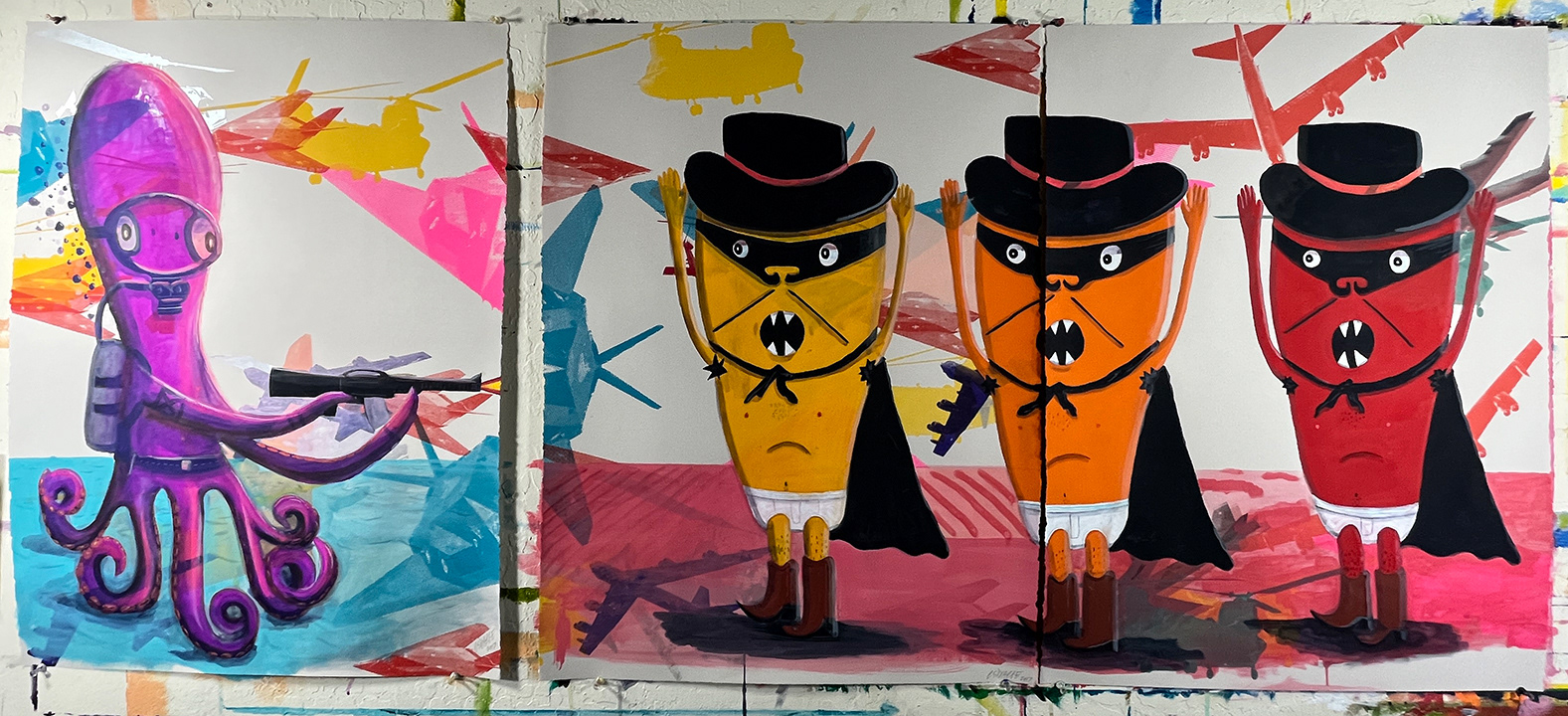 Paintings on heavy printmaking paper using bright colors and my skewed sense of humor.