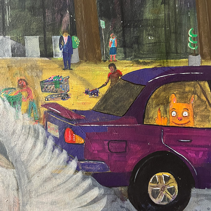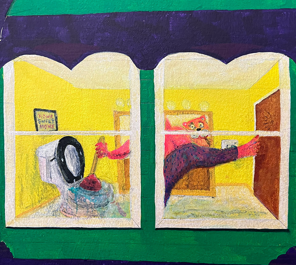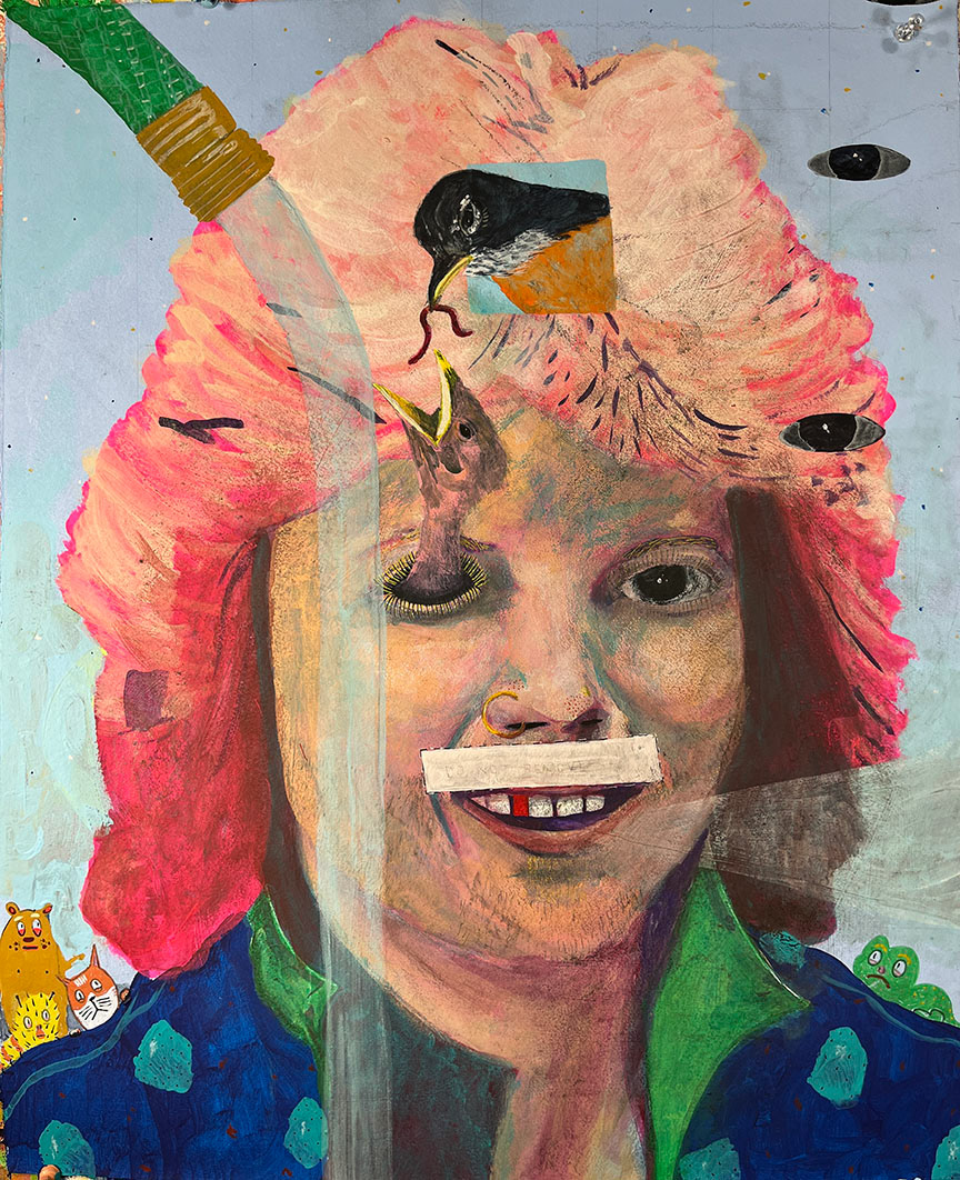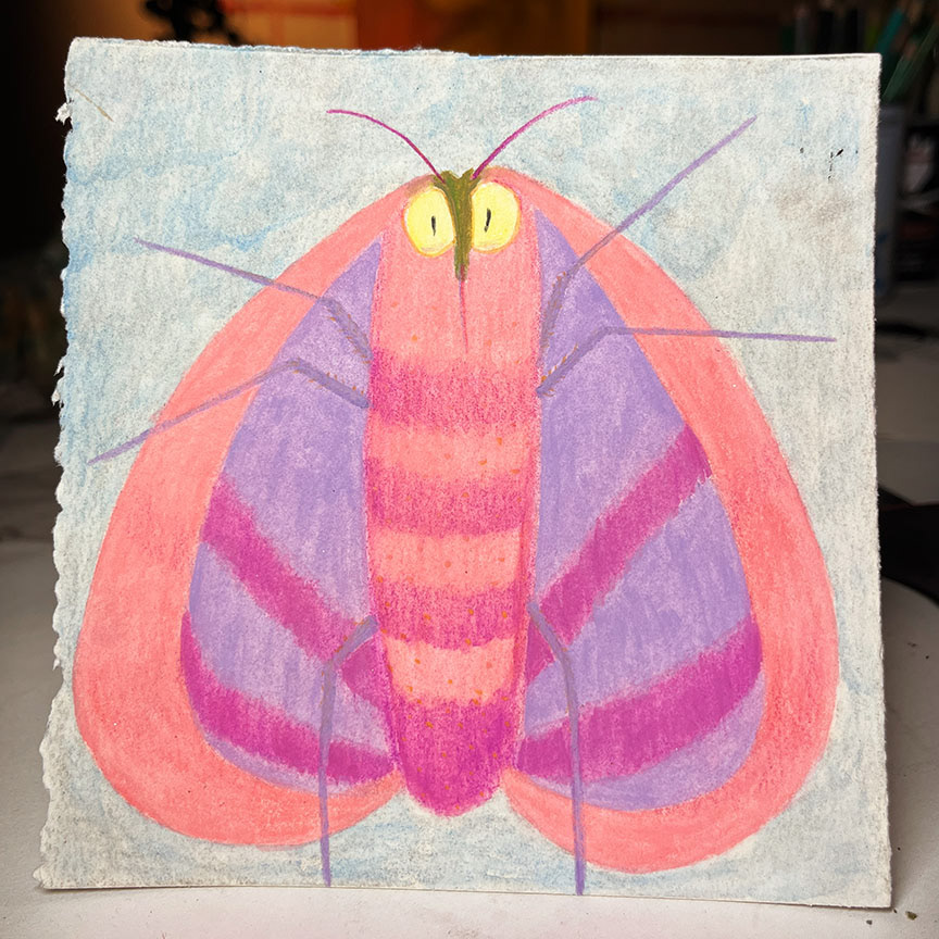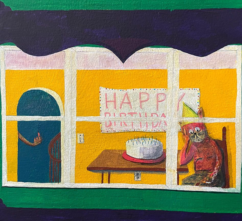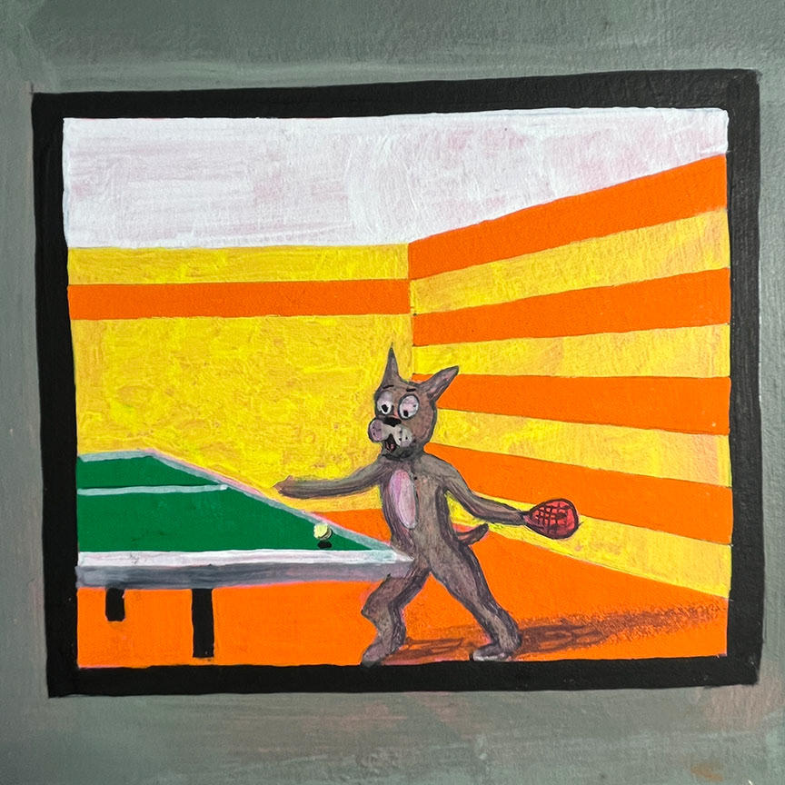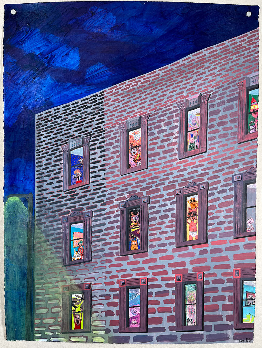 Paintings on heavy printmaking paper using bright colors and my skewed sense of humor.