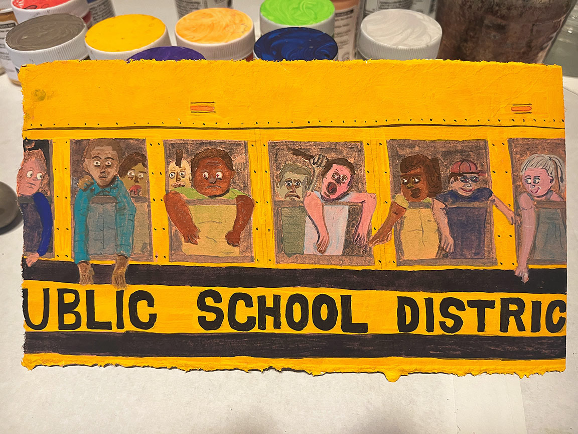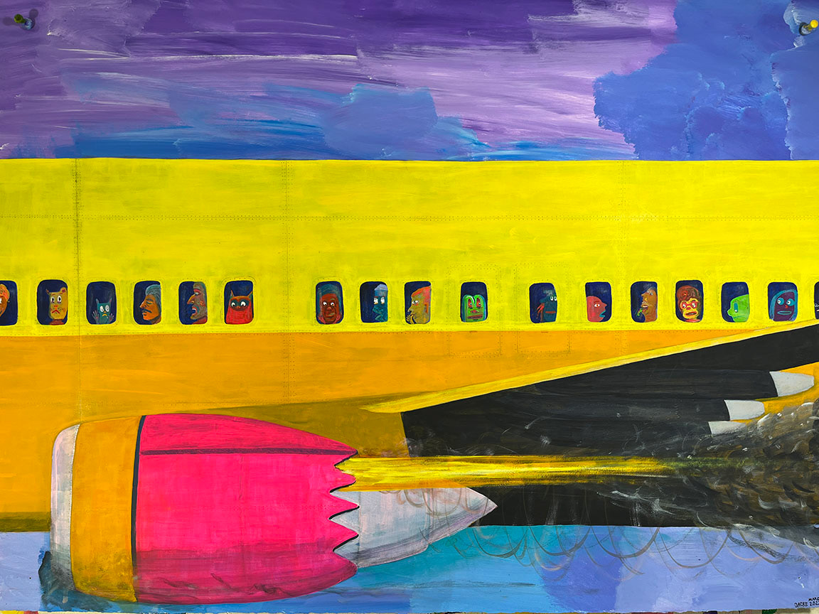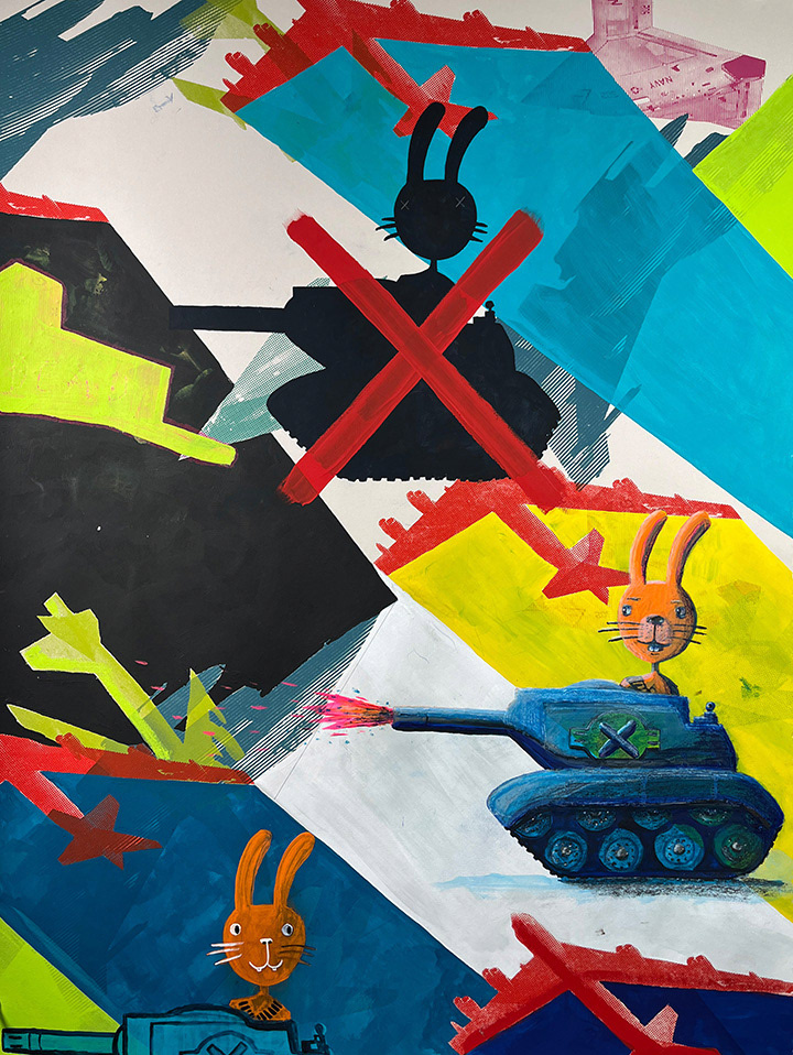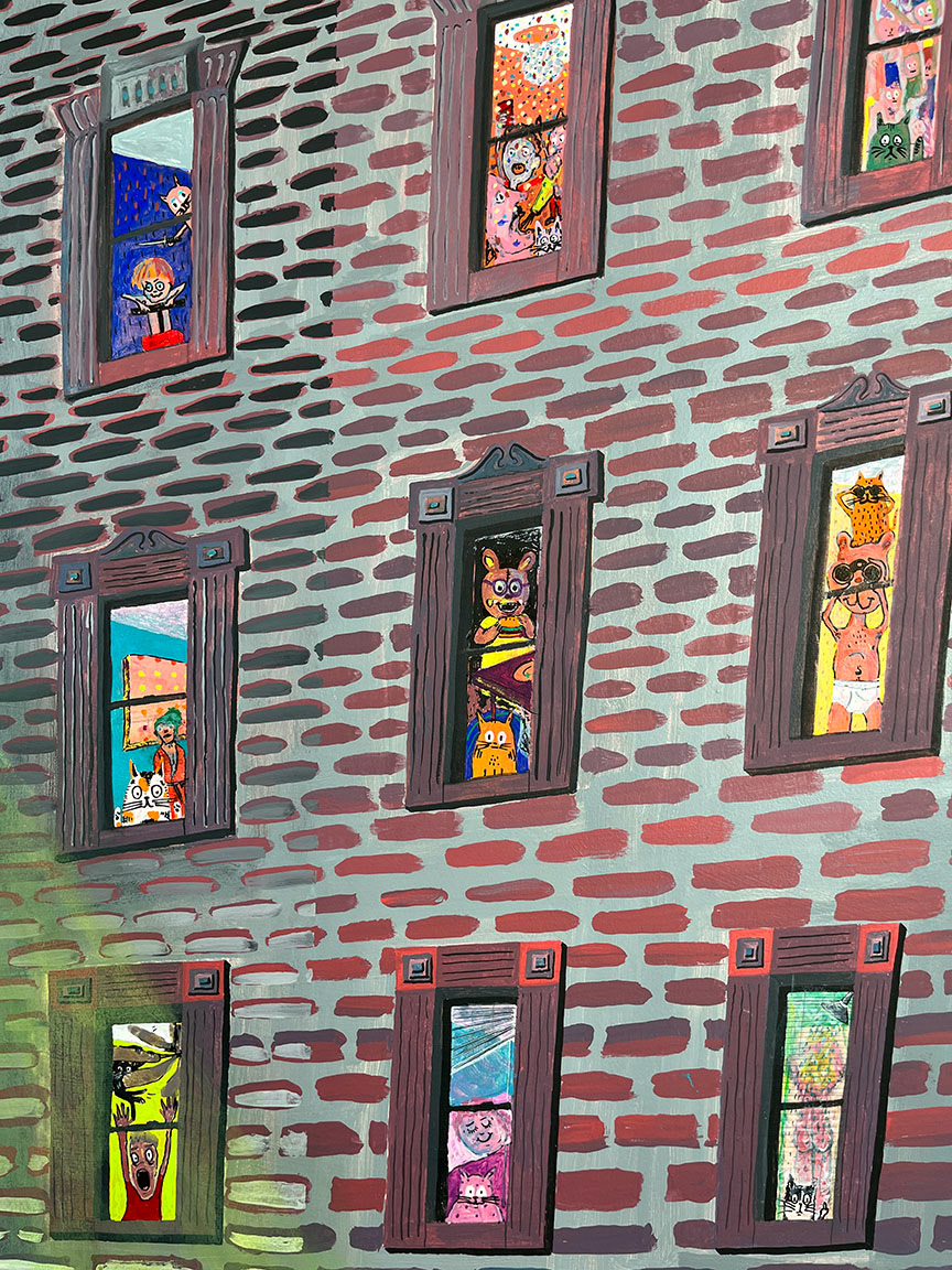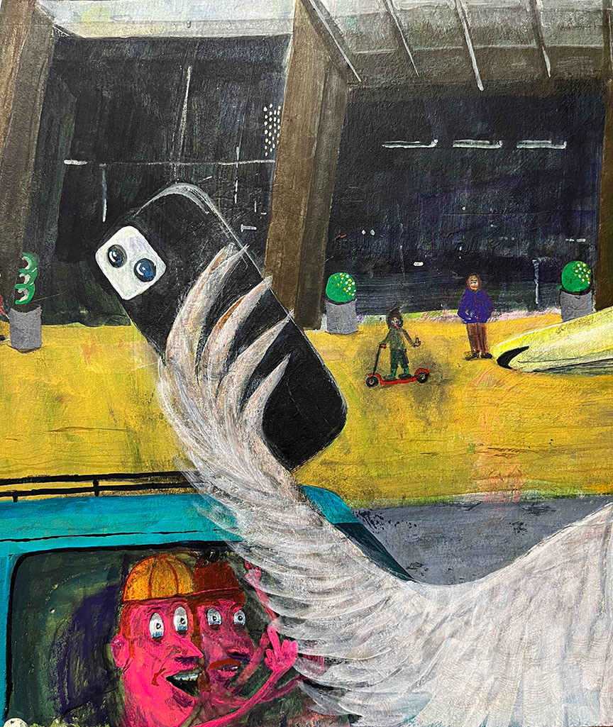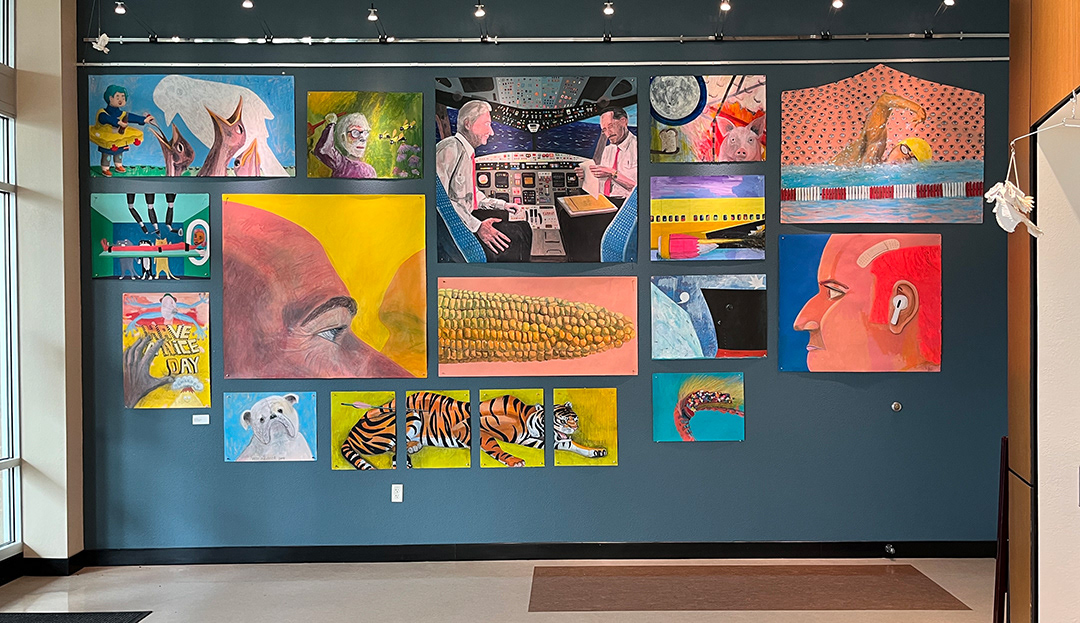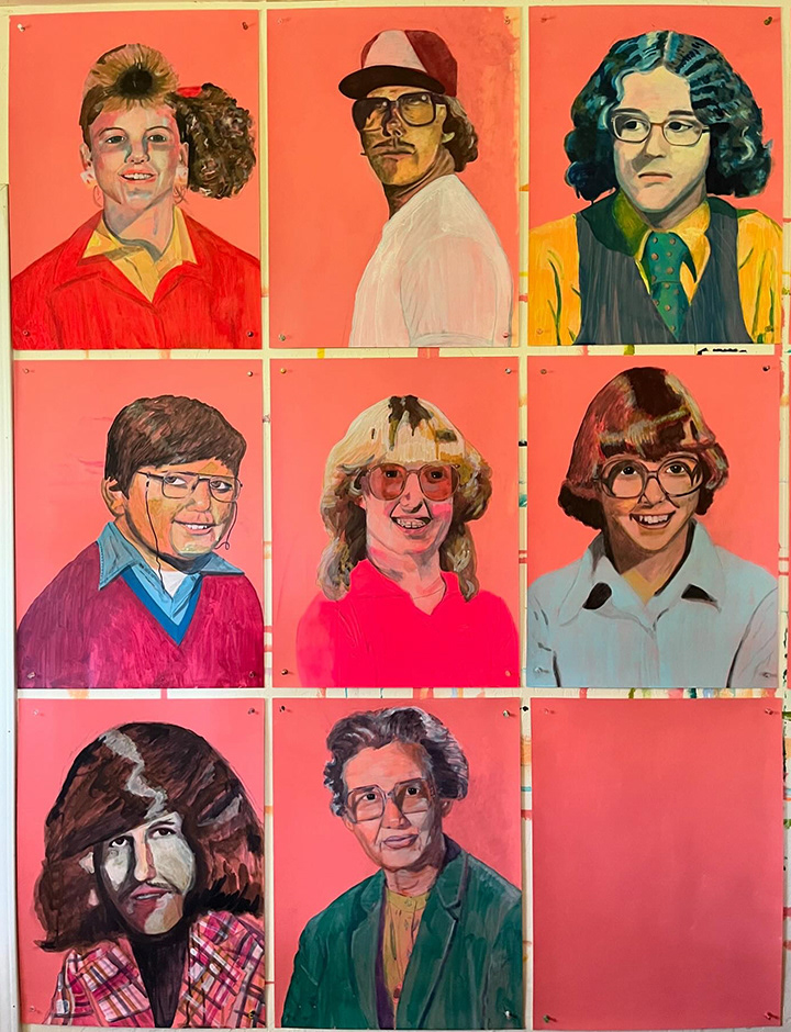 Paintings on heavy printmaking paper using bright colors and my skewed sense of humor.